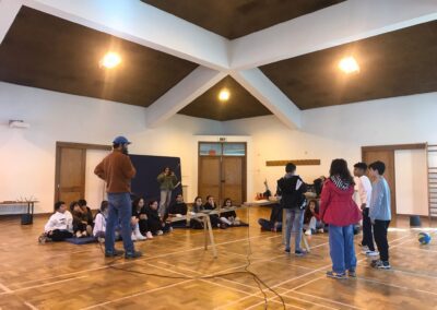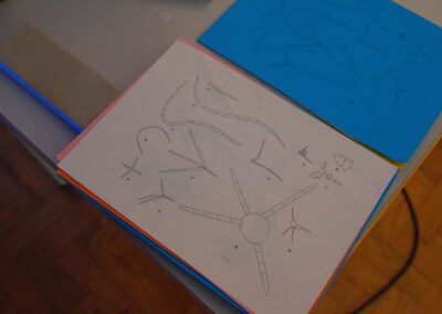 Explora-se com os alunos as potencialidades coreográficas e de movimento coletivo a partir deste imaginário da rabdomância.