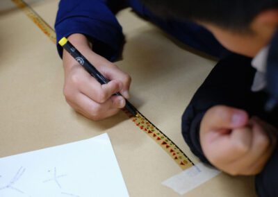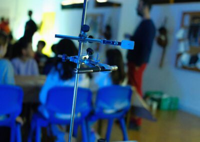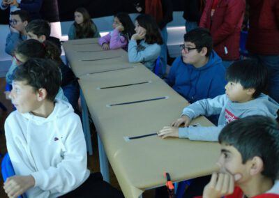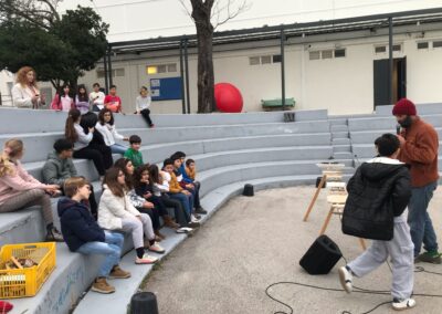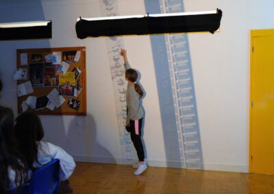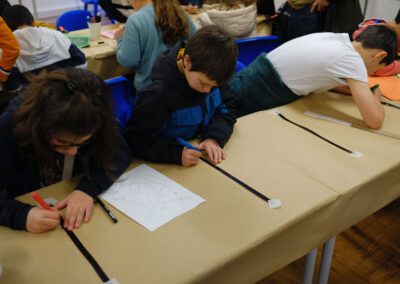 Cada uma das “pedras” do litofone tem escrito na parte de trás uma palavra: Terra, água, lua, células, insectos, música, dinossauros, agricultura, etc. Depois de reveladas todas as palavras, os alunos são desafiados a criar uma