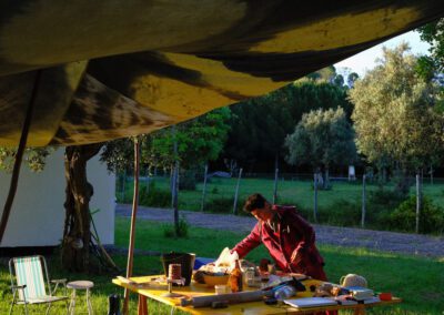O coletivo Guarda Rios reúne artistas e investigadores com práticas de pensamento diversas — artes plásticas, performance, ecologia, arquitetura, tecnologia ou arqueologia – que são ativadas a partir de processos artísticos participativos – caminhadas, jogos, dinâmicas de grupo, ações coletivas, momentos de escuta e observação, desenhos e instalações na paisagem envolvendo as comunidades.